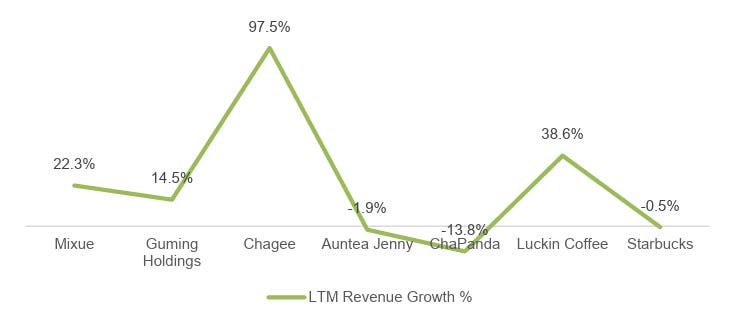 In terms of growth, Mixue trails Chagee and Luckin, but materially exceeds all other competitors. A large driver of the difference in growth rates is simply the law of large numbers. Mixue has more than triple the number of locations as Luckin, and more than seven times that of Chagee. Additionally, the higher menu prices (RMB15-24 for Chagee and RMB14-21 for Luckin) also result in faster revenue growth as stores and volumes scale. LTM revenue growth rates are summarized in the following chart.