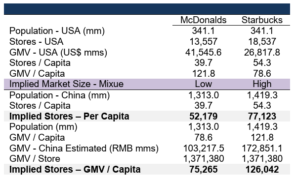 According to this data, the growth story for Mixue is relatively straightforward and robust for the medium term. The question then becomes; how quickly will the Company reach a saturation point for the Chinese market? To answer this question, we took store count data from Starbucks and McDonalds for the US market and compared them to the population of the USA to arrive at a number of stores per capita. We also used system-wide sales (GMV) for both markets to reach a GMV per capita estimate. We then combined China’s population figures for the same period (2024 – although we note that China’s population is expected to decrease by 100 million people by 2050 so have added the latter figure as a conservative estimate in this exercise) and the range of stores per capita to reach a range of implied stores for the Chinese market. We also used these population figures and the GMV / capita from McDonalds and Starbucks to calculate an GMV estimate for Mixue and then divided this figure by the average GMV/ store in Mixue’s system to arrange at another range of implied stores. This latter approach normalizes for Mixue’s smaller store footprint and its higher comparative productivity. Our findings are as follows: