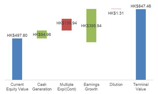 Per the above table, we note that a price of HK$325/share would be a decline of 48% from the Company’s all-time high, but a 27% premium to Mixue’s IPO price. Our view is to wait for a decline of 20% from current levels to start accumulating a position. To conclude this section, we provide a waterfall of the expected return components, assuming our base case with no SSS growth and an exit multiple of 20x.