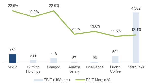 As we shift to an operating profit perspective, the success of MXG’s model emerges dramatically. Even when focusing on the low-end of China’s FMD market, the Company generates industry leading EBIT margins, as well as the highest operating profits in absolute terms. We observe that Mixue’s operating profits are also almost equal to its FMD tea competitors and exceed those of Luckin with revenues that are one third lower. From an RMB/USD equivalent basis, MXG’s operating profits would exceed those of Starbucks. We summarize this data below.