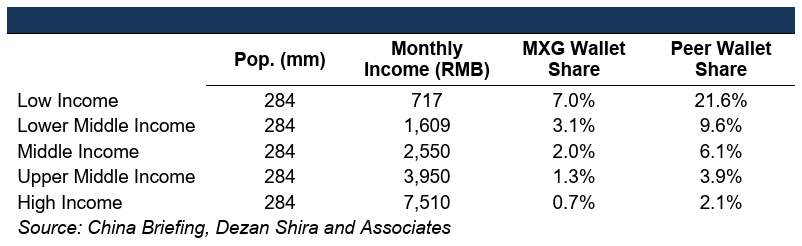 For reference, in the US, the average individual spends between 2.5 and 5% of monthly income on takeout drinks. Given this datapoint, we see that ten drinks per month from Mixue would be affordable by 80% of the population, while less than 60% of the population could afford the same at competitors. In fact, seven Mixue drinks per month would be affordable by all quintiles, based on the average monthly income (although this somewhat overstates the reality given the income figures below the median in the lowest income quintile). Nevertheless, we do not see the income data for China creating a material difference between the Company’s Total Addressable Market and its Serviceable Available Market. Additionally, we see this data as confirming the view that Mixue is well positioned to continue expanding in 3rd Tier and lower markets, while peers will struggle to accomplish the same results given their menu prices.