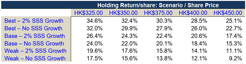 For our valuation and expected return analysis, we opted for an exit multiple based on EBIT. From the peer group, we observed that North American competitors with flat or nominal revenue growth traded at 21-29x EBIT, while the equivalent peer in China (Yum China) traded at 15x. Given our worst cast scenario implies an exit growth rate of 6%, we believe that 20x is the floor for an exit multiple. Assuming a 20x multiple results in an intrinsic value of HK$635.50, suggesting that today’s price of HK$497.80 is a 22% discount from fair value. The same exit multiple implies a 13% compound annual return or 1.7x cash-on-cash for a five-year period. Our sensitivity of returns with each case with no SSS growth, and each case with 2% SSS growth is as follows.