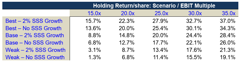 At Mixue’s current price, the Company trades at an EBIT multiple of 28.6x, presenting some risk of a negative multiple rerate at the end of the forecast period. For that reason, our view is that the Company does not confidently pass our hurdle return, even though a permanent loss of capital is very low as forecasted growth would offset a multiple decline. However, we believe the Company would meet our return target if: 1) we gained confidence in MXG’s ability to generate SSS growth, or 2) the Company sold off to ~HK$400 per share. Our sensitivity of expected returns to share price is as follows.