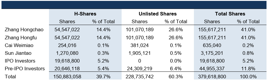 As a result of Mixue’s IPO in March 2025, the Company has two classes of shares: Hong-Kong listed H-shares, and unlisted shares in mainland China. From an economic and voting perspective, the two classes of shares rank equally. However, in terms of legal rights and capital distributions, the H shares have minimal recourse to actions in mainland China and are exposed to potential delays (or non-receipt) of dividend payments from FX controls. We summarize the various shareholders across both classes in the following table.
