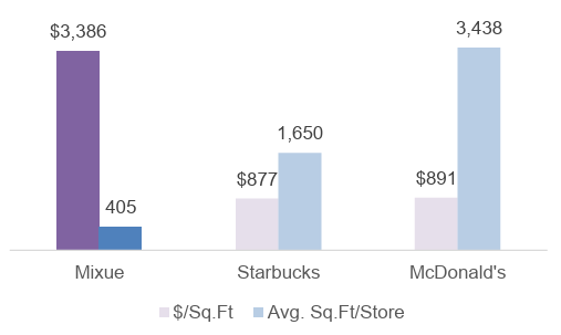 As noted previously, Mixue’s supply chain allows the firm to sell menu items profitably while substantially undercutting competitors prices. These low prices, combined with Mixue’s brand IP results in highly attractive economics for franchise operators. Not only do franchisees benefit from strong demand created by MXG’s ecosystem and IP, they also benefit from some of the lowest up-front and recurring franchisee fees in the segment. Additionally, the median store size is approximately 400 sq. ft, leading to extremely high revenue per square foot, further benefitting franchisee economics. For example, assuming a 1 RMB = 1 USD equivalency (to reflect MXG’s cost base and franchisee perspective), Mixue stores are almost four times more productive than Starbucks stores are. A comparison of average store size and productivity for Mixue, Starbucks, and McDonald’s is as follows.