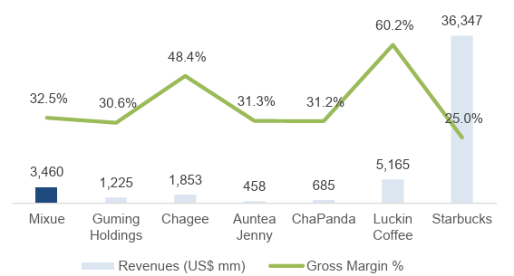 Mixue Group boasts an enviable combination of robust profitability and strong growth, even though the Company is already one of the largest players in China’s FMD sector. In revenue terms, Mixue is almost equivalent to Guming, Chagee, Auntea Jenny, and ChaPanda combined. At the same time, MXG generates gross margins that exceed Guming, Auntea Jenny, and ChaPanda, even while delivering the lowest cost menu items to its consumers. We summarize this data in the following chart.