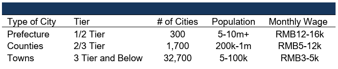 Beyond the franchisee perspective, Mixue’s moat has resulted in one of the largest chain presences in 3rd Tier and lower cities in China. As of December 31, 2024, almost 24,000 (or 57% of the total in China) of the Company’s locations were in 3rd Tier and below cities (defined as cities with populations of 5 million people or less), or more than the next four largest competitors combined. MXG’s presence in these cities exemplifies the strengths of the company, as these cities typically have smaller populations and lower average wages; see below table for an overview of key statistics for the various classifications of cities in China.
