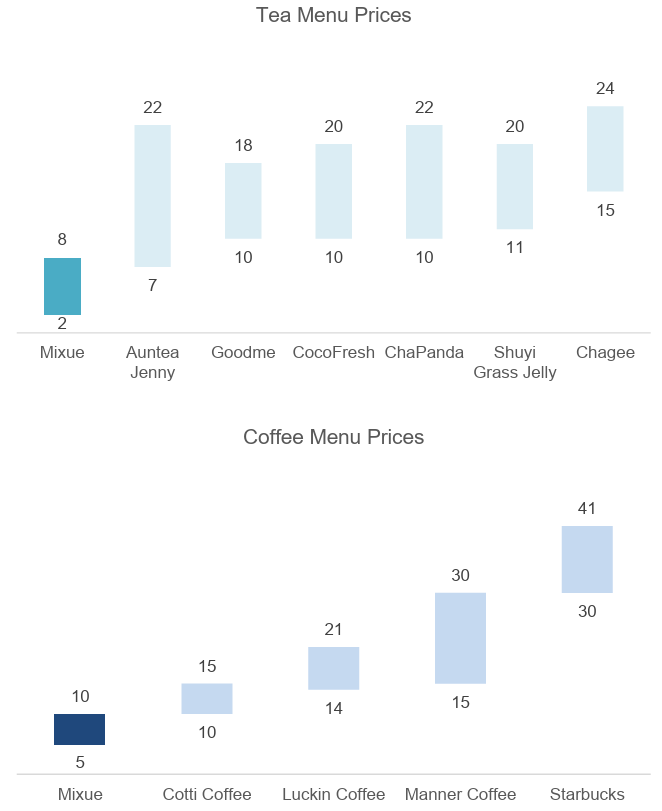 As a result of the Company’s ecosystem, Mixue is able to consistently source and deliver ingredients at much lower costs than its major competitors. For example, MXG is able to deliver lemons and milk powder at costs that are 20%+ and 10% lower than peers, respectively. The final result from a consumer perspective is menu prices that are substantially lower than peers. We summarize the range of menu prices of MXG and its competitors in tea and coffee categories in the following two charts.