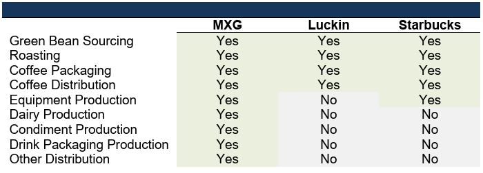 But while Lucky Cup is currently a small player in the coffee market, the Company has a distinct advantage stemming from its supply chain ecosystem that its rivals do not share. Luckin and Starbucks both procure raw coffee beans, roast beans, and distribute beans, but rely on third party suppliers for dairy products, condiments, packaging and the distribution of each. In contrast, Lucky Cup has insourced all of these functions, including store equipment design and production (Starbucks also designs their own equipment but Luckin purchases machines from suppliers). A summary of this value chain position is as follows.