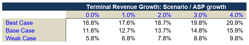 As noted previously, we are cautious around forecasting SSS growth for Mixue stores given the Company’s position as a low-price leader in the category and anticipated growth in lower income geographies. Nonetheless, Mixue does have an opportunity to drive GMV per store growth by introducing new items at higher prices, raising prices on existing items, driving mix shift up in higher income locations, or a combination of these factors. We thus thought it prudent to isolate the impacts of SSS growth relative to the operating scenarios and understand how SSS growth assumptions impacted terminal growth rates and therefore our exit multiple assumptions. We summarize these findings in the following table.